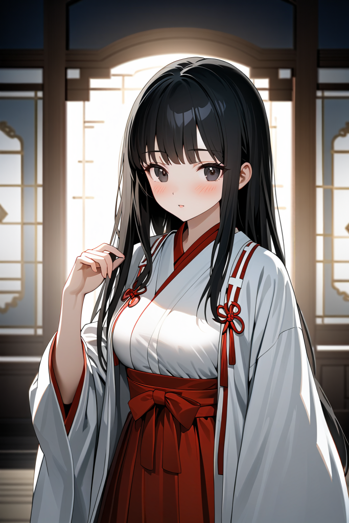 上記プロンプトに黒髪、黒目を足して、より日本古来の巫女に。