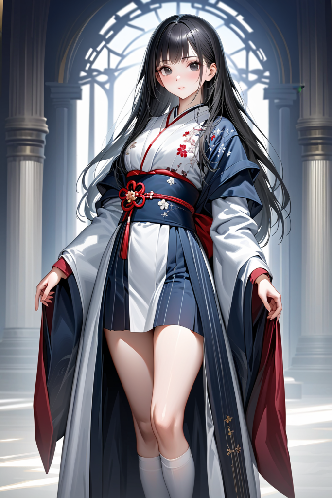白と深い藍を基調にした和洋折衷の創作和装。着物の袖や帯の意匠を活かしつつ、ミニ丈のシルエットで現代的な軽やかさを加えている。花の刺繍と赤い組紐が上品なアクセントとなり、静謐な空間に立つ姿は凛とした気品と可憐さを併せ持つ印象を与える一枚。